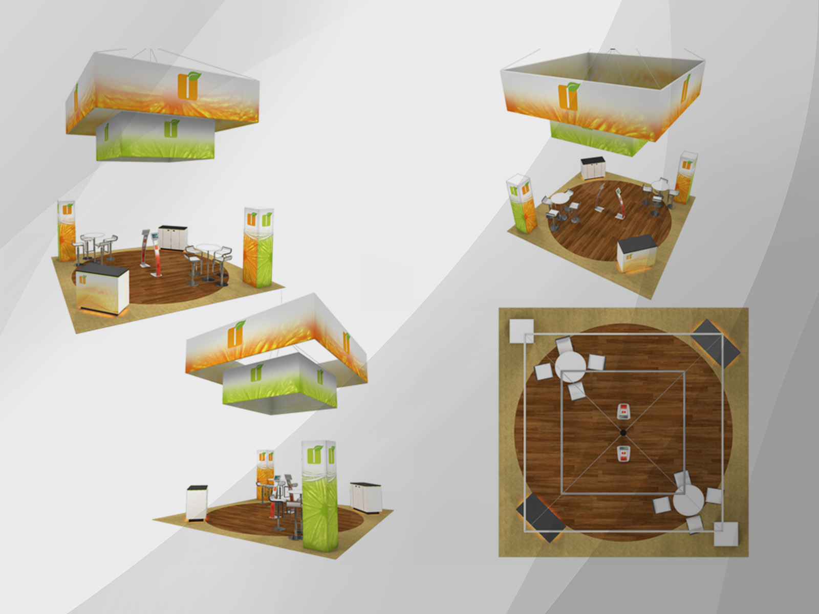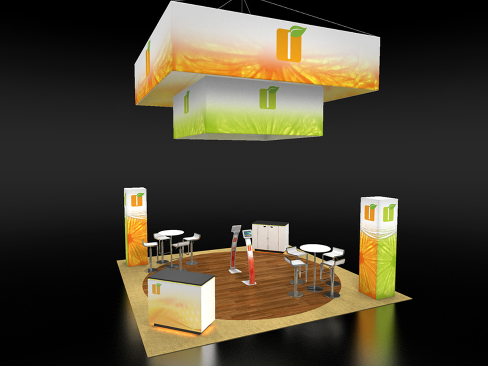 Connect with show attendees in this open floor-plan design. The double-layered hanging Skyflyer® elegantly frames the booth space from above and will be sure to attract attention. The two towers have eight backlit graphic sides to further broadcast your