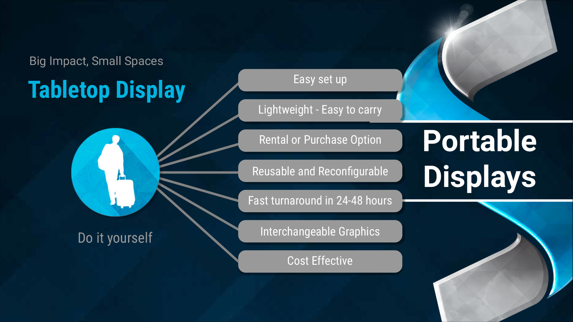 In smaller spaces, tabletops are an easy way to exhibit. Skyline has designed several tabletop systems that are easy to transport, quick to install and are built with Skyline quality to give you the very best value.